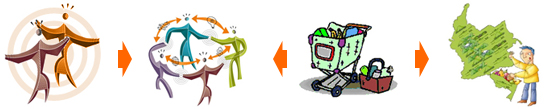 | 1. Los Círculos Solidarios de Consumo (Consumidores) Los Círculos Solidarios de Consumo son las estructuras básicas del circuito económico solidario de la Comercializadora Solidaria Coomeva. Constituyen la expresión de la necesidad que tienen los asociados y sus familias como consumidores. | | | |  | 2. Redes Zonales de Círculos Solidarios de Consumo Son organizaciones asociativas que integran los diferentes Círculos Solidarios de Consumo de una ciudad, de una parte de ésta o de una región, con el fin de realizar las diversas actividades que hagan posible el pleno cumplimiento de los objetivos de los Círculos Solidarios de Consumo y del Circuito Económico Solidario en su conjunto. | | Las redes zonales de Círculos Solidarios de Consumo son instancias que buscan reunir geográficamente, o gremialmente ( esto segundo ocurrirá cuando en su proceso de expansión y diversificación el proyecto integre a otras entidades solidarias), las unidades económicas básicas (los Círculos Solidarios de Consumo), y tienen por objeto esencial configurar estratégicamente el proceso de las economías de escala, las cuales se van constituyendo a medida que se avanza en la sumatoria y unificación de la demanda de bienes y servicios alcanzada originalmente en los círculos. | | |  | 3. Central Cooperativa Mayorista de Compras (Intermediarios) La Central Mayorista de Compras es una empresa solidaria integrada, por una parte, por las diferentes organizaciones que hacen parte del circuito económico, esto es, los Círculos Solidarios de Consumo, la Cooperativa de promoción y fomento del Comercializadora Solidaria Coomeva, COOMEVA Cooperativa Multiactiva y por otro lado, por las precooperativas y/o cooperativas especializadas de trabajo asociado que se crearán para desarrollar las operaciones de la Central con el fin de hacer realidad el objeto social de los Círculos Solidarios de Consumo. | | Para efectos del desarrollo estratégico de la CSC, en cada ciudad, zona o región administrativa de Coomeva, operará (Esto dependerá de los tamaños y magnitudes y de otras variables, pero el asunto es que el proyecto será, por principio y política empresarial, descentralizado y federativo) una Central Mayorista de Compras, cuando así las circunstancias lo requieran.